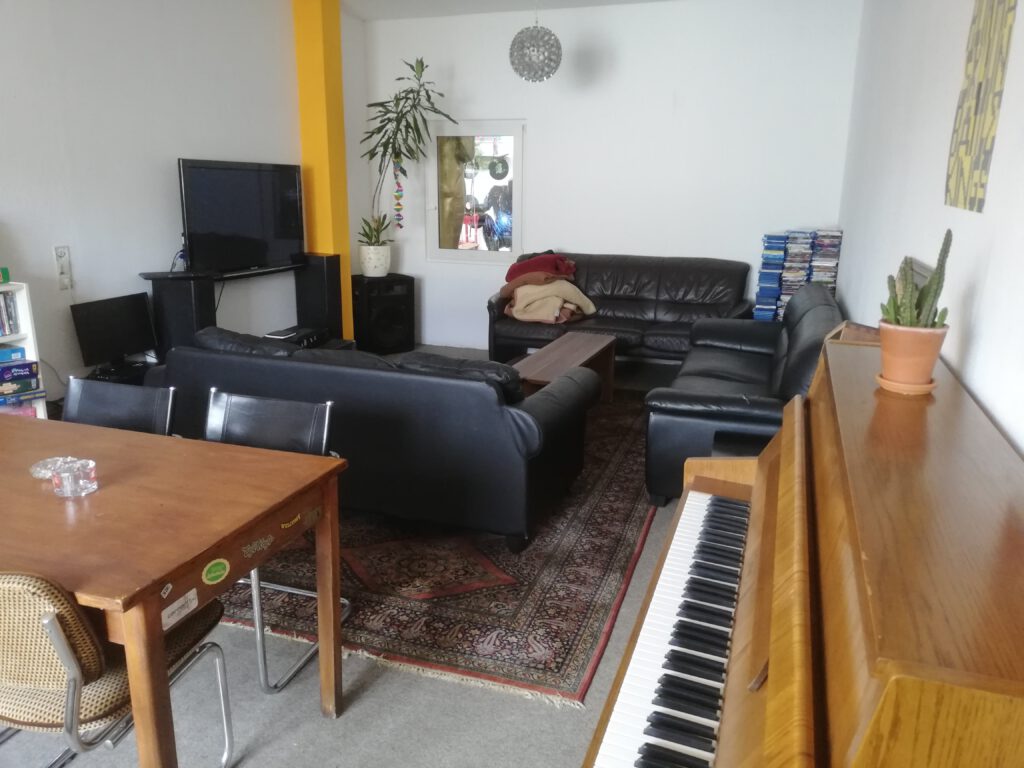 Eine großzügige Couchecke zum gemütlichen Beisammensitzen sowie ein Billardtisch und ein Kicker mit angrenzender Bar machen unsere Halle zu einem netten Versammlungsort unserer WG. Eine Bühne mit Instrumenten (Schlagzeug, Bass, Gitarre und Ukulele) und Anlage bietet Musikinteressierten die Möglichkeit für kleine Sessions oder Parties mit Live-Musik. Oft sitzen wir hier bei einem (oder zwei) Bierchen zusammen und verbringen unsere Abende.